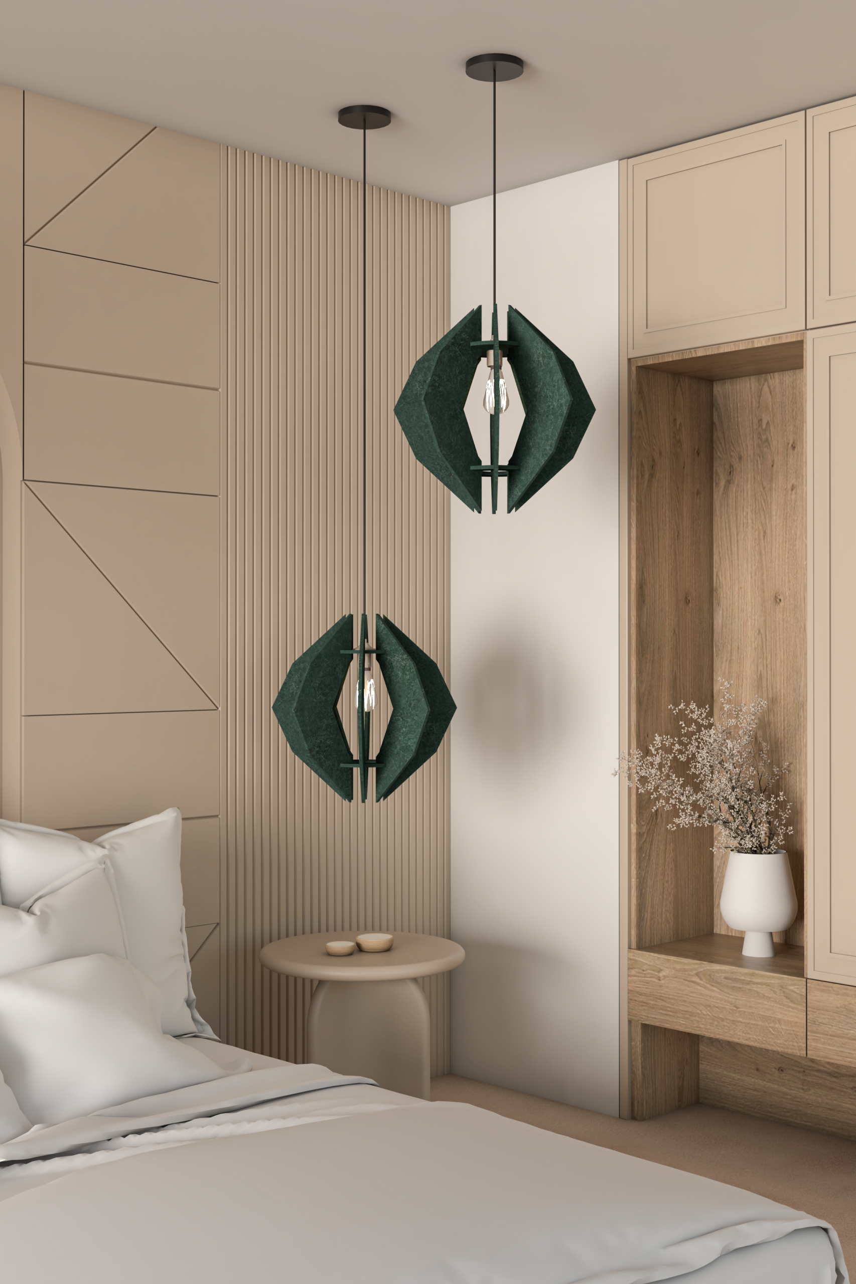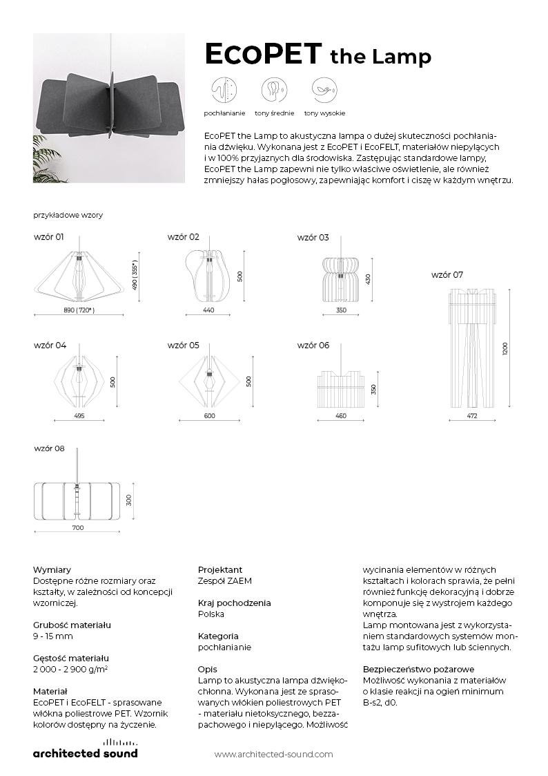 Lamp to akustyczna lampa o dużej skuteczności pochłaniania dźwięku. Wykonana jest z EcoPET i EcoFELT, materiałów niepylących i w 100% przyjaznych dla środowiska. Zastępując standardowe lampy, Lamp zapewni nie tylko właściwe oświetlenie, ale również zmniejszy hałas pogłosowy, zapewniając komfort i ciszę w każdym wnętrzu.