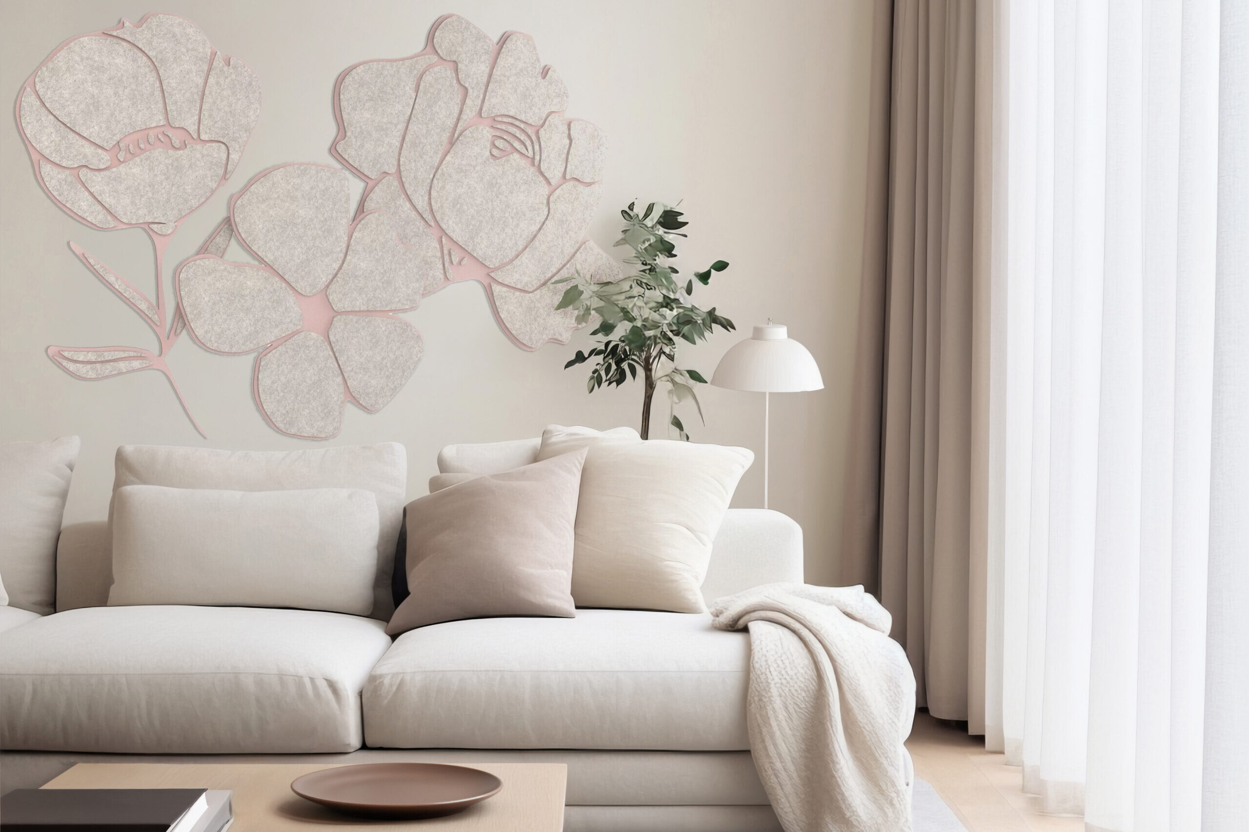 Panele są wycinane w kształty stylizowanych kwiatów i mogą być montowane bezpośrednio na ścianie, na tapecie lub innym podłożu – zarówno jako pojedyncze elementy, jak i rozbudowane kompozycje. Ich forma i miękka faktura wpływają korzystnie nie tylko na akustykę, ale także na estetykę wnętrza.