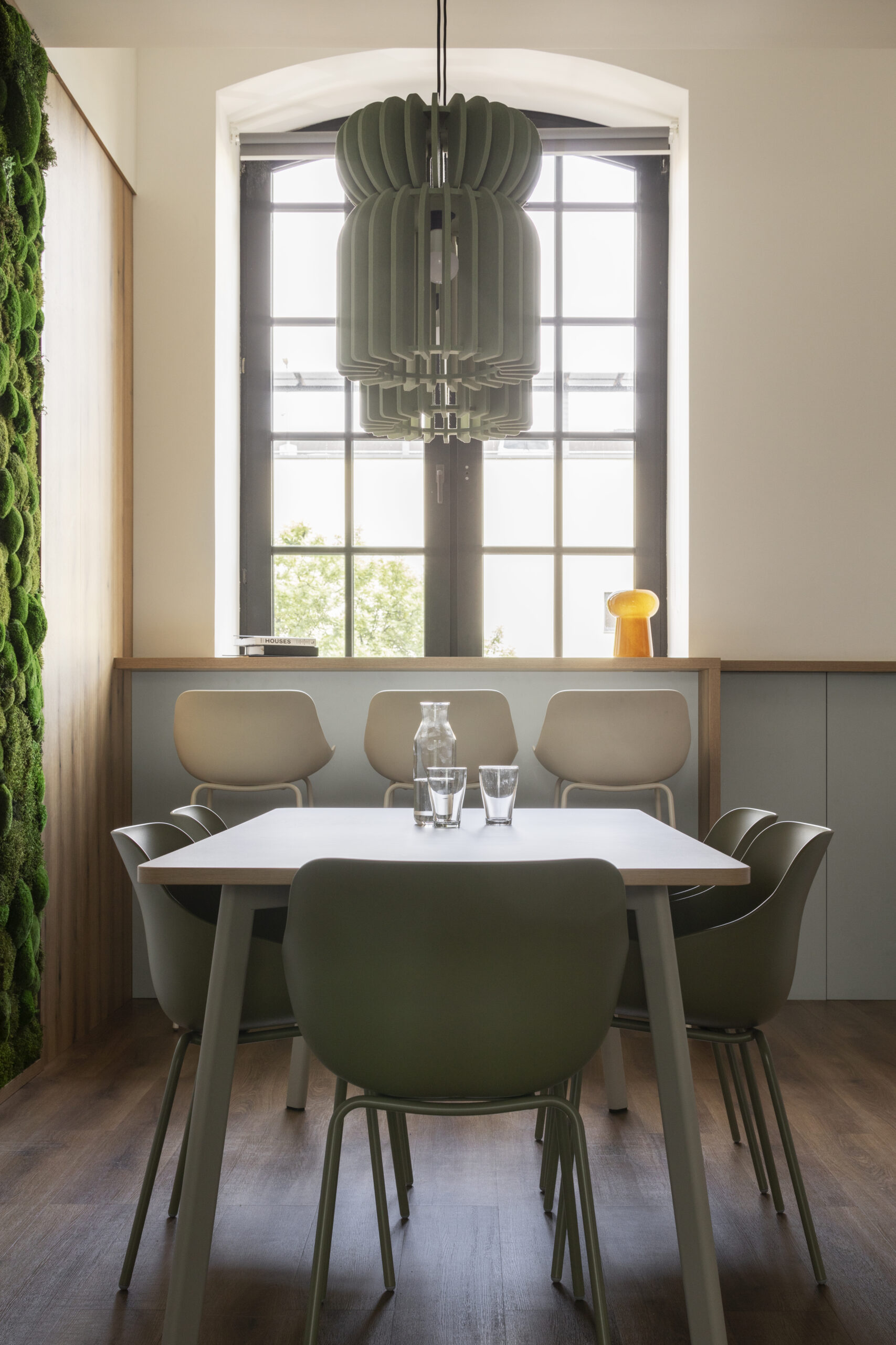 - W strefie kuchennej oliwkowe lampy świetnie korespondują z zielenią ściany, dodając wnętrzu miękkości — i akustycznie, i wizualnie.